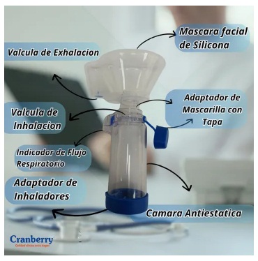 Aerocamara doble Valvula con mascarilla de silicona, Dispositivo médico antiestático que permite administrar de manera segura y precisa medicamentos inhalados a los pulmones de pacientes adultos.