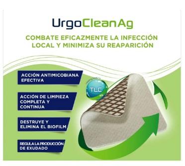 UrgoClean Ag está indicado para el tratamiento de infecciones locales, con una acción combinada antimicrobiana, de desbridamiento y de limpieza en heridas crónicas con exudado (úlceras de pierna, úlceras por presión, úlceras de pie diabético) y heridas agudas (quemaduras, heridas traumáticas, heridas quirúrgicas), con riesgo o signos de infección local.